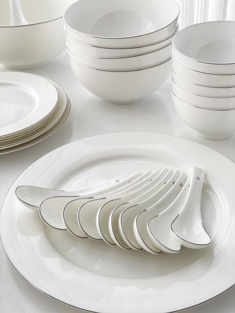 Bộ đồ ăn viền bạc 50pcs mang phong cách châu Âu hiện đại, nổi bật với đường viền bạc tinh tế trên nền sứ trắng trang nhã. Sản phẩm không chỉ phục vụ nhu cầu ăn uống hằng ngày mà còn là điểm nhấn sang trọng cho không gian bàn ăn, thể hiện gu thẩm mỹ và đẳng cấp của gia chủ.