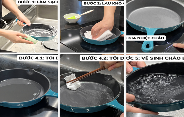 Để chảo nguội tự nhiên, sau đó thực hiện tôi dầu lại 2 - 3 lần để lớp chống dính bền chắc.