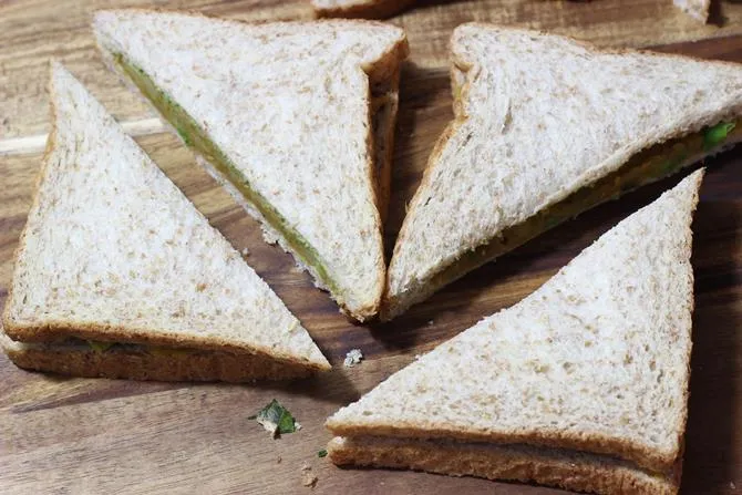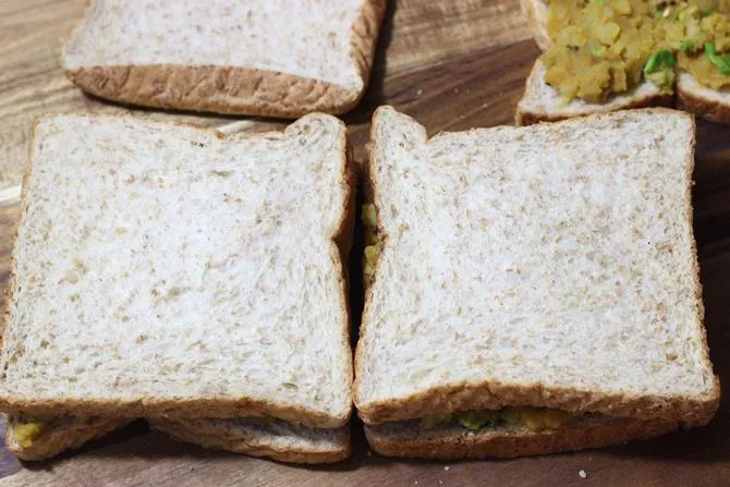 6. Đặt các lát bánh mì lên một tấm ván rồi phết masala khoai tây lên. Bạn cũng có thể phết tương ớt xanh này trước rồi phết khoai tây đã tẩm gia vị lên.