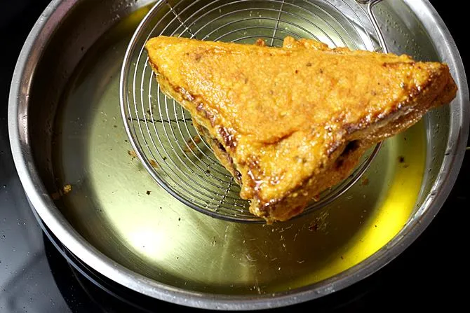 Giữ bánh mì sandwich và đặt nó vào bột đã chuẩn bị. Chỉ phủ nó ở một bên. Đặt mặt bột xuống chảo nóng. Để bánh mì pakora nấu cho đến khi chín