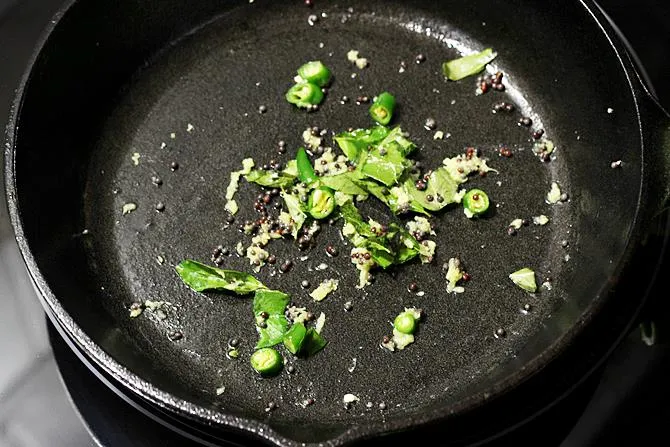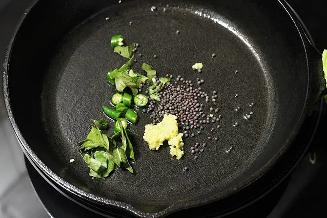 2. Đun nóng 1 thìa dầu trong chảo. Thêm 1 thìa cà phê gừng, 1 đến 2 quả ớt xanh xắt nhỏ và 1 nhánh lá cà ri. Bánh mì pakora của Bắc Ấn Độ được làm không có mù tạt nhưng bạn có thể tìm thấy chúng ở các vùng khác. Nếu thích bạn có thể thêm ¼ thìa cà phê hạt mù tạt vào đây.