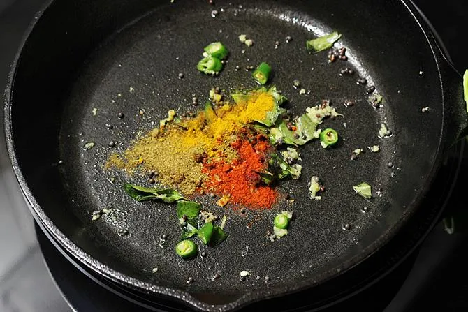 4. Thêm 1/8 thìa cà phê hành, ½ thìa cà phê bột ớt đỏ, ¼ thìa cà phê bột nghệ và ½ thìa cà phê garam masala. Trộn đều.
