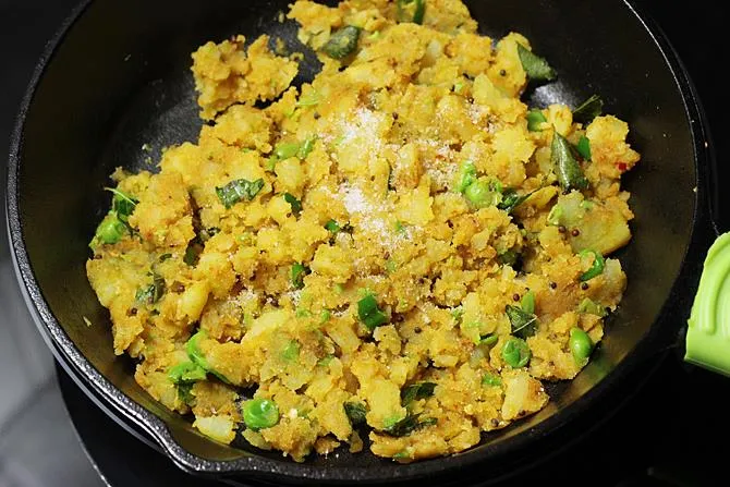 5. Thêm khoai tây nghiền vào, rắc nửa muỗng cà phê muối và trộn đều. Bạn cũng có thể thêm lá rau mùi và vắt vào một ít nước cốt chanh. Nếm thử và thêm muối nếu cần.
