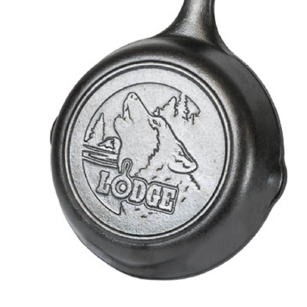 Chảo gang Lodge L3SKWLWF 16.5cm với đáy khắc hình sói ấn tượng, mang tính thẩm mỹ cao, thích hợp cả nấu ăn và sưu tầm.
