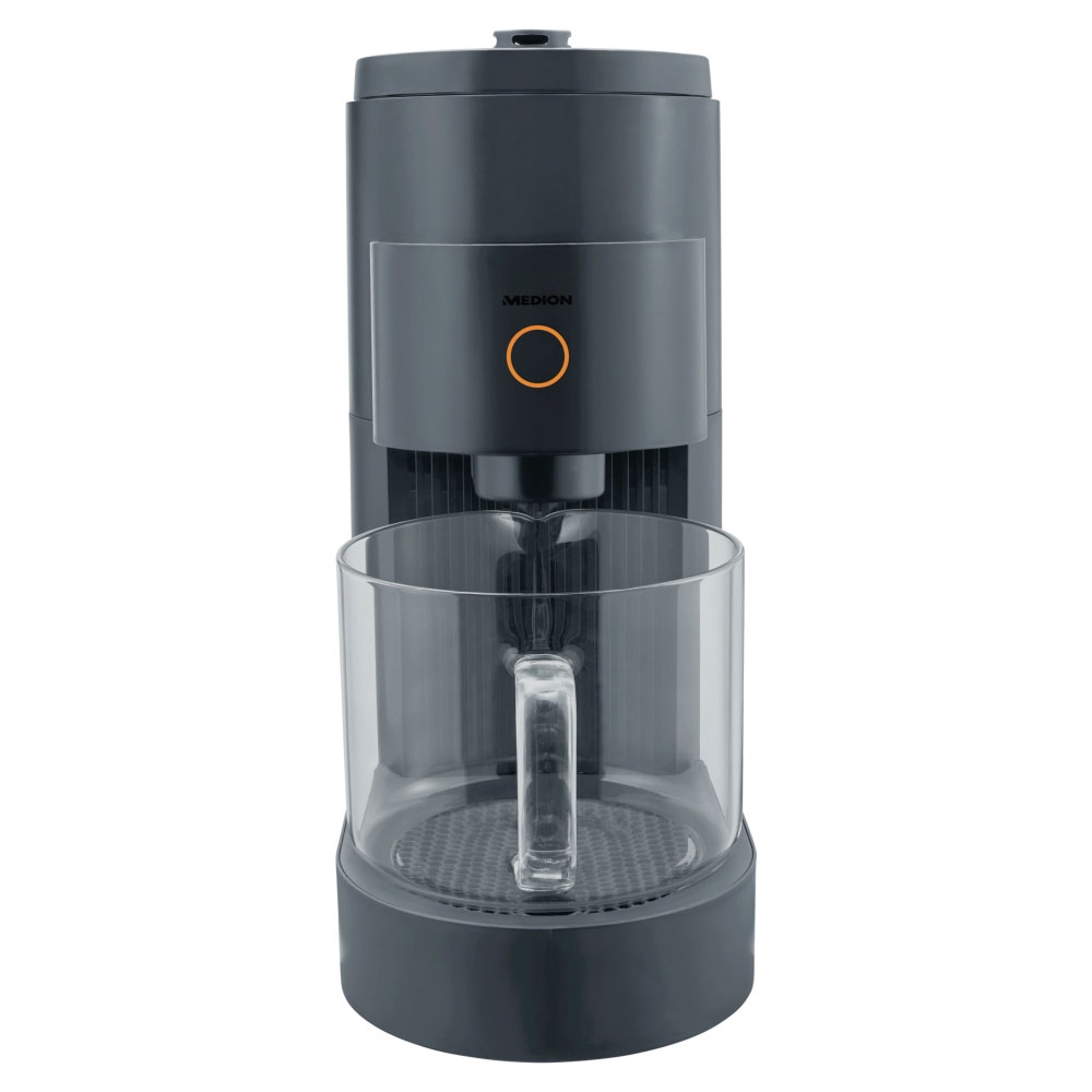 Nhìn tổng thể máy làm sữa hạt Medion MD 11200 vẫn giữ nguyên thiết kế của đàn anh đó là thiết kế dạng phân tầng. Tầng trên cùng là khoang chứa nguyên liệu xay. Ở giữa nhô ra phía trước chính là bảng điều khiển. Tiếp là bảng điều khiển cảm ứng. Tầng dưới cùng chính là động cơ ở phía sau và phía trước là nơi lấy sữa thành phẩm và khoang chứa nước thải sau khi vệ sinh. Phía sau vẫn là bình đựng nước. Máy Medion MD 11200 sẽ tự lấy nước để làm sữa hạt.