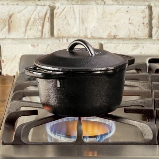 Nồi gang Lodge 21.4cm dung tích 1.89L, kích thước gọn gàng, thích hợp cho nấu canh, hầm thịt, nấu súp hoặc làm món nướng trong lò.