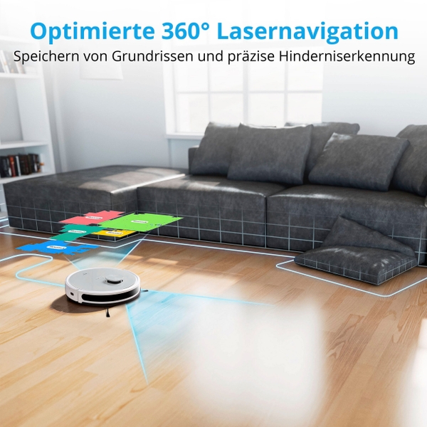 Vẽ bản đồ 2D toàn căn hộ trên app và điều hướng di chuyển: vẽ bản đồ trên ứng dụng, hiển thị trạng thái hoạt động của robot đồng thời hiển thị cả tiến trình làm sạch. Từ bản đồ được thiết lập, robot sẽ tính toán để lựa chọn đường đi nhanh chóng và hiệu quả nhất cho chính nó, hạn chế tối đa việc bỏ sót vị trí đồng thời tiết kiệm năng lượng, thời gian hơn! Có thể lưu trữ bản đồ cho từng tầng khác nhau.