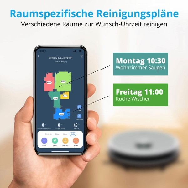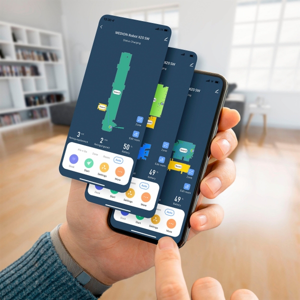 Robot hút bụi lau nhà Medion X21 SW+ luôn làm sạch chính xác theo mong muốn của bạn. Điều này cũng áp dụng cho lượng nước được sử dụng trong chế độ lau. Thông qua ứng dụng, bạn có thể chỉ cần nhập lượng nước mong muốn tùy thuộc vào ứng dụng và lớp phủ sàn và tận hưởng sự tươi mát.